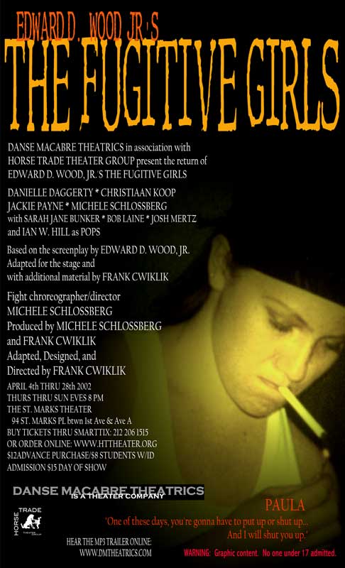 The smash hit of the initial EdFest 2000, The Fugitive Girls! became an instant cult classic, earning sellout business during its initial run and playing to standing room only houses during its 2002 revival. Ed Wood’s obscure sexploitation cult favorite presents four deadly women and their desperate bid for freedom, as they rape, pillage, and plunder their way through late-60’s America, leaving a trail of death, destruction, and horror in their wake. Sex, violence, pop culture, and shocking ugliness are the hallmarks of this gruesome, brutally entertaining bad girl action comedy. With psychotic hippies, swinging bachelors, crazed veterans, toothless hicks, sex, guns, drugs, and rock and roll, and one the ugliest and most unsettling climaxes this side of a snuff movie, this one is definitely NOT for the squeamish.