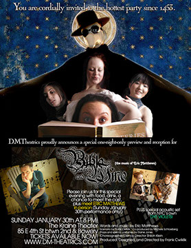 The third installment in the BADASS RECORD COLLECTION series, Bible and Wine was an extraordinary blend of music, movement, dance, story, and design, using the music of pop maestro Eric Matthews as inspiration for a meditation on history, faith, lust, and immortality. Loosely inspired by Chaucer's masterwork The Canterbury Tales and the art of the high Middle Ages, Bible and Wine was a daring and unique event which combined director Frank Cwiklik's trademark immersive theater mindscapes with movement, dance, and performance, set to the music of one of the most engaging and exciting recording artists of the past twenty-five years.