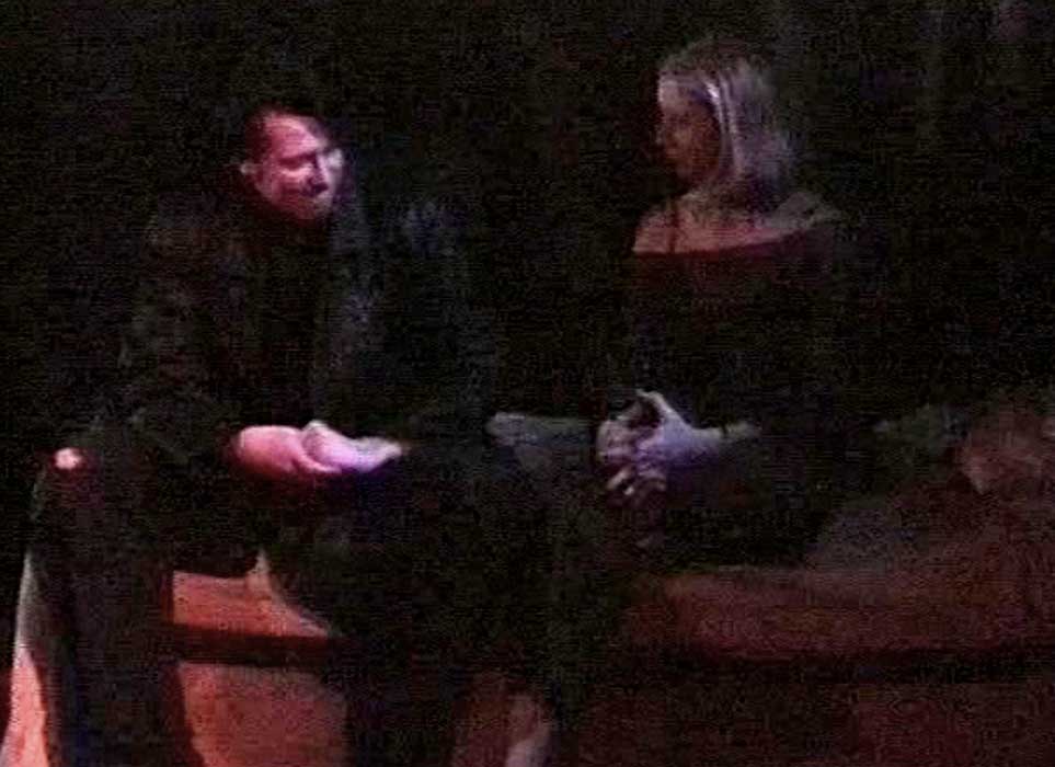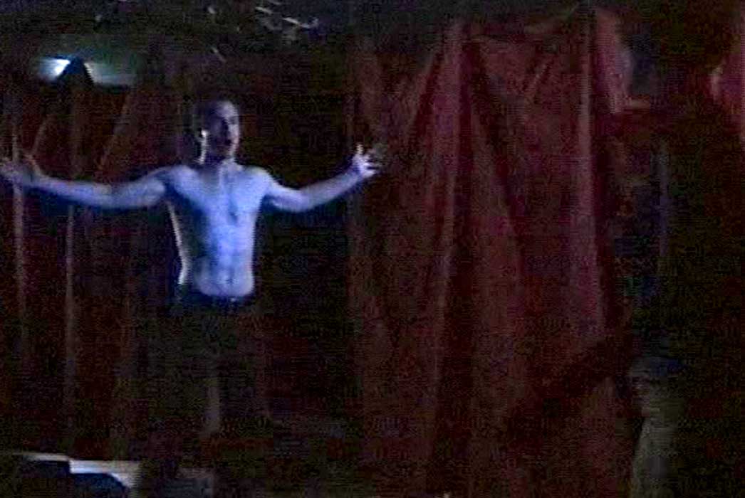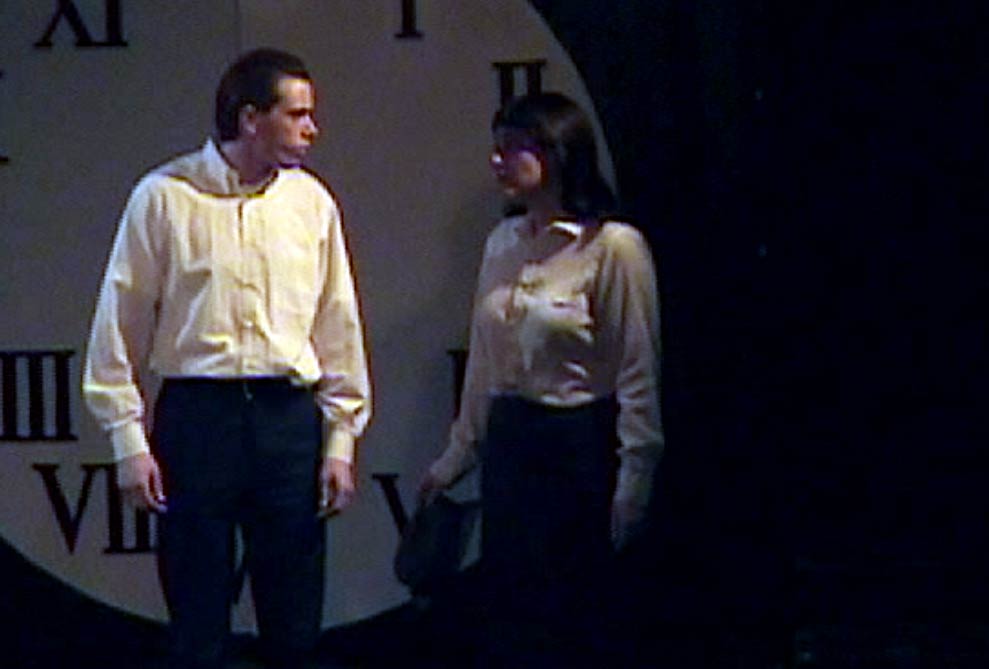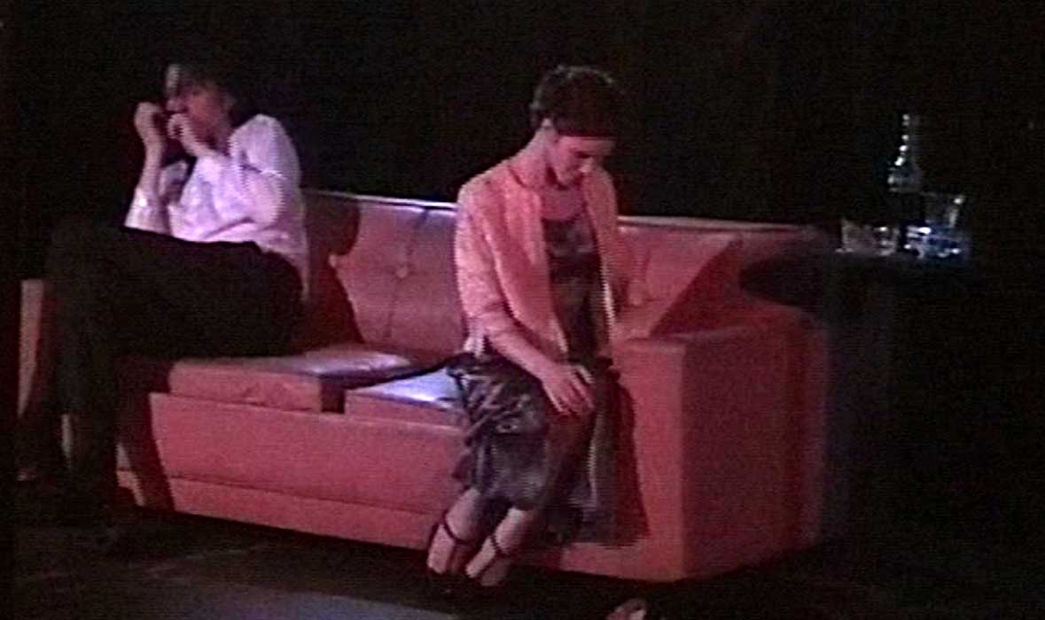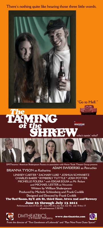 The DMT Shrew was Blue Collar Comedy Tour meets Shakespeare, set in the urban South with a redneck Petruchio, a rabble-rousing, hard-drinking Kate, and suitors who were essentially beta males scrambling for attention. The prologue was filmed and shown to the audience bracketed by clips of football, KFC ads, and NASCAR races, hopefully setting up our NYC audiences for a southern mock-fest. The prologue itself was fun to do -- meant to look like an early-70s European art film showing on a public cable station, it gave us a chance to send up both our own pretensions and the audience's expectations, and hopefully bring Shakespeare's intentions up to date. The full preshow reel was about twenty minutes and framed to fit the available projection area, but I've cut this down to just the relevant sections (the prologue and the Hortensio's Auto World ad preceding) and reframed it for a full screen. -- Frank Cwiklik, NYC