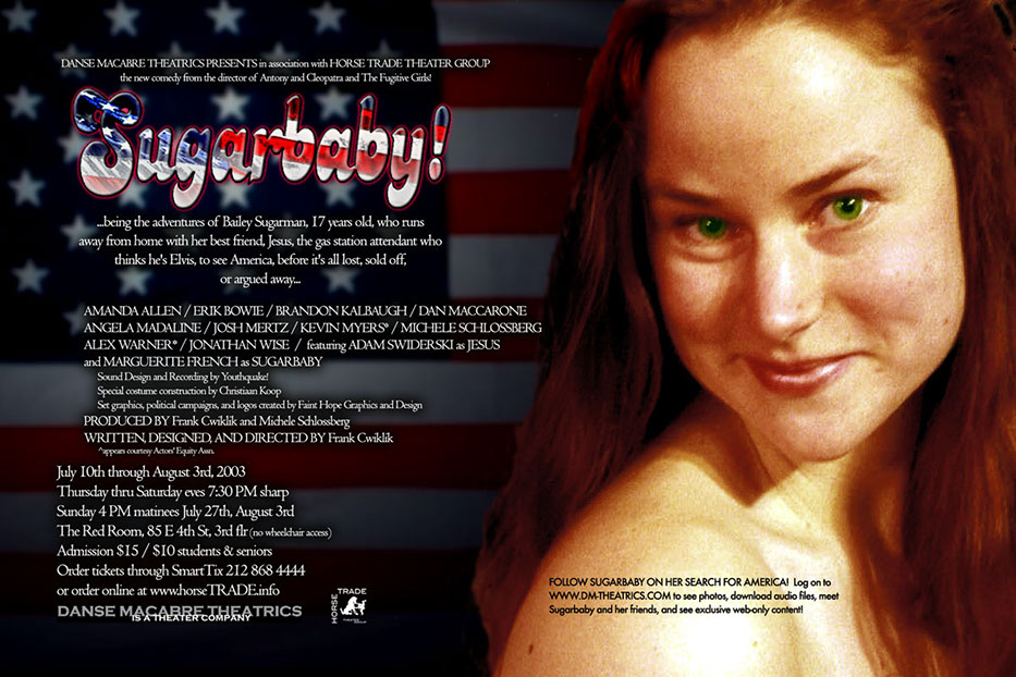 Writer/Director Frank Cwiklik's most-published and likely best-known original work, Sugarbaby! is a raucous, mischevious, sexy, nasty, noisy, no-holds-barred satire on American politics, mores, and hysteria, a cross-country chase that winds from backwoods America to sin city itself, Las Vegas; from the marshlands of Florida, to -- Heaven itself?? Ending in a stirring, riotous take-no-prisoners march on the Great Mall in Washington, DC, no one is safe and nothing is sacred in the least political political comedy ever to appear on the New York stage. Playing to packed houses and rave reviews, Sugarbaby! was published in the New York Theater Experience's Plays and Playwrights 2004, and has been used as course material for theater and playwriting classes on the high school and college level.