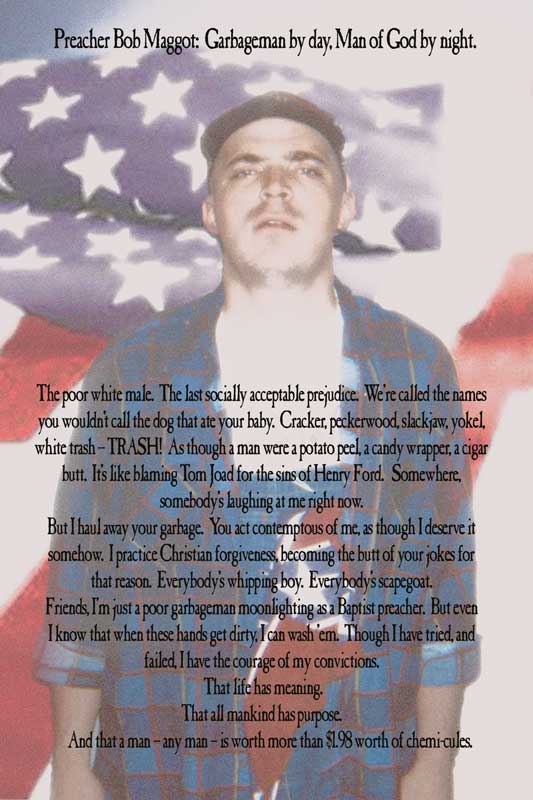 Preacher Bob, garbageman by day, Baptist preacher by night, trying to reconcile the demands of God with the longings of the flesh. ... Toby, sixteen, bitter, confused, lost in a world that doesn't understand him and in love with a married woman at the end of her rope. ... Pubert, a glue sniffing malcontent who sleeps all day and ruts all night with Angel, the gothic psychotic alien abductee. ... Mama, TV junkie, food glutton, convinced that the world is full of ghosts and piss. ... Hayseed, goatlover, mental deficient, more concerned with his obsessions than his family. Stereotypes? Lowlifes? Lost? Insane?