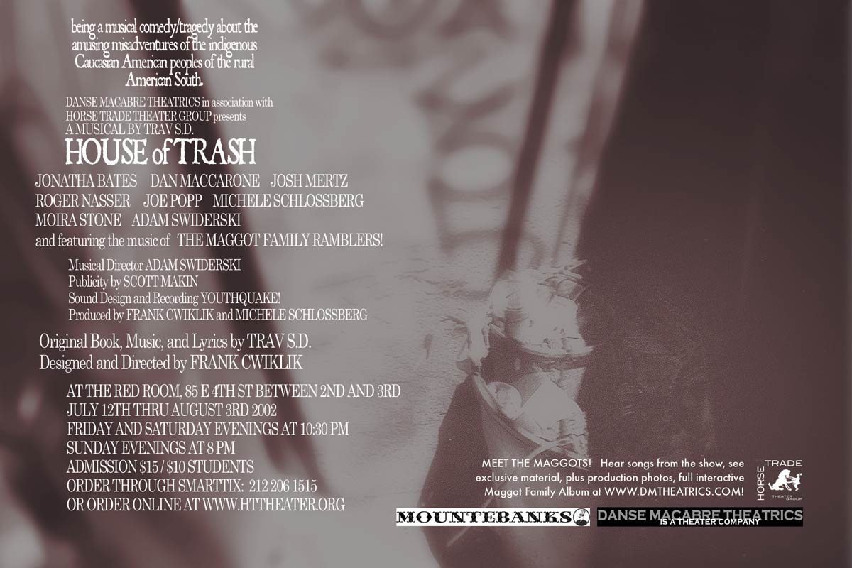 The mutant love child of O Brother Where Art Thou and The Rocky Horror Show, House of Trash is new vaudeville legend and bestselling author Trav S.D.'s sinister, darkly comic cornpone musical extravaganza. Featuring original songs, vaudevillian lunacy, and the world's first truck driving gorilla companion, this show both explores and destroys every cliché you’ve ever heard about rural Americana – deftly satirizing and sympathetically humanizing the kind of people most New Yorkers would run screaming from. Thought provoking, hysterically funny, disturbing, infectious, alarming, moving, it’s not like anything you’ve seen before, and if you think you have, you haven’t seen it like this.