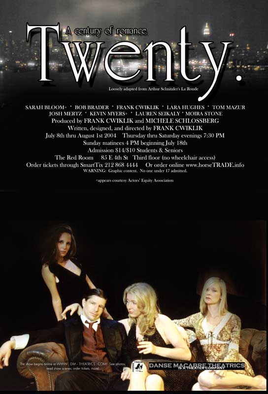 Adapted freely from Arthur Schnitzler’s legendary “La Ronde”, Twenty traces the history of eleven men and women from various walks of life, as they fall in and out of love, bed, and time. Fact and fiction blend seamlessly in this steamy, intimate, emotionally charged piece as a ghostly parade of starcrossed romantics confess their desires, hopes, dreams, and fears to their lovers. Moving, funny, unnerving, unsparingly honest, each scene captures an instant in the life of the fastest, largest, most frightening, most intriguing hundred years in recorded times.