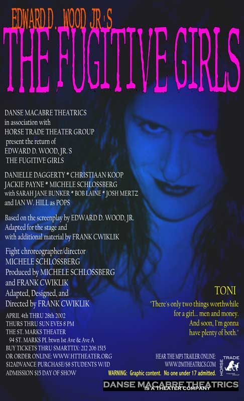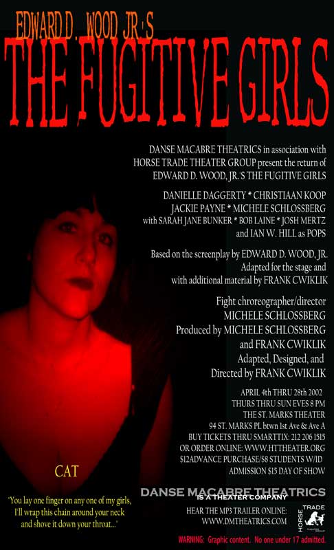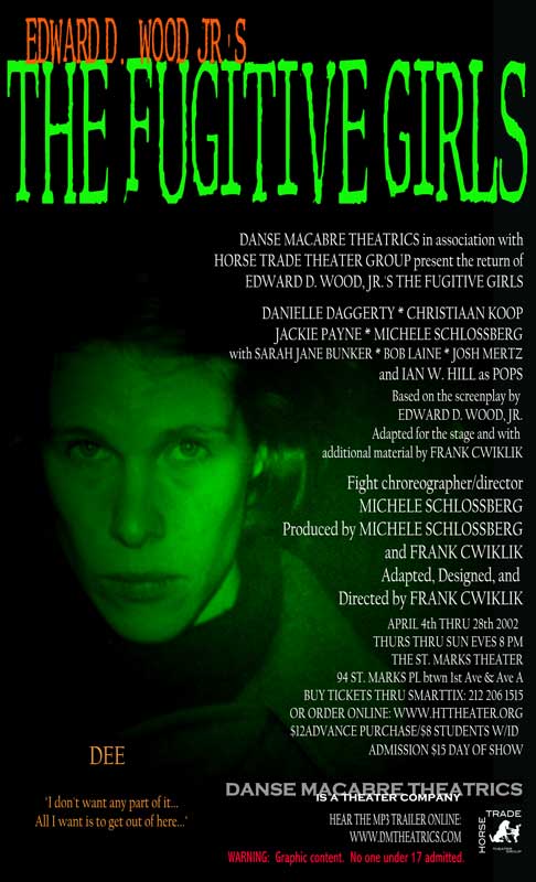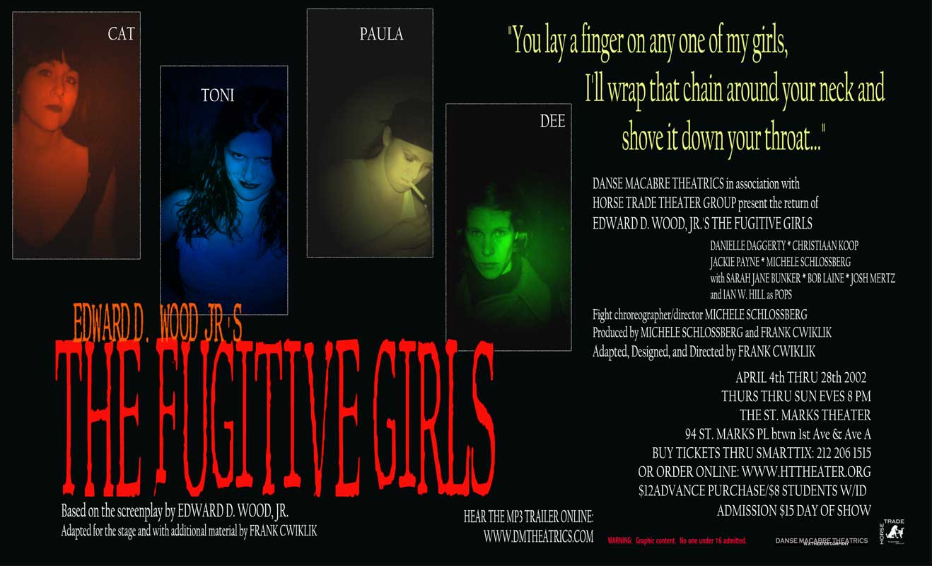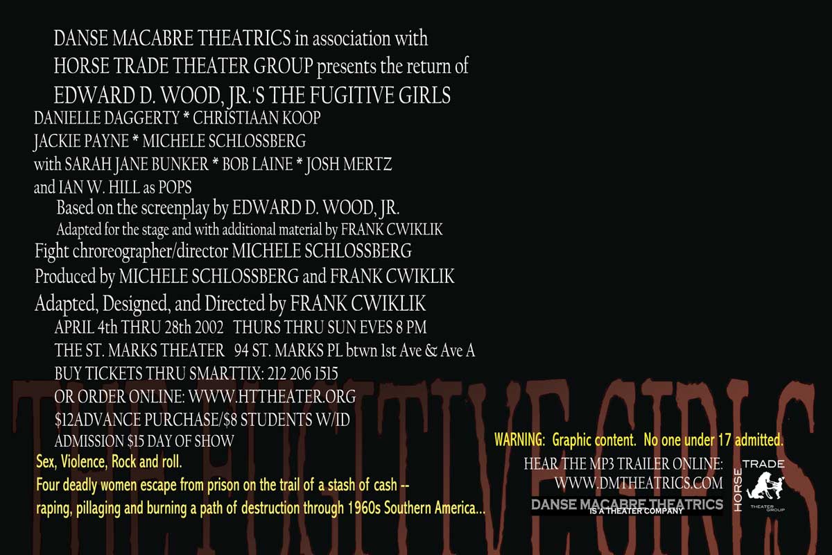 The smash hit of the initial EdFest 2000, The Fugitive Girls! became an instant cult classic, earning sellout business during its initial run and playing to standing room only houses during its 2002 revival. Ed Wood’s obscure sexploitation cult favorite presents four deadly women and their desperate bid for freedom, as they rape, pillage, and plunder their way through late-60’s America, leaving a trail of death, destruction, and horror in their wake. Sex, violence, pop culture, and shocking ugliness are the hallmarks of this gruesome, brutally entertaining bad girl action comedy. With psychotic hippies, swinging bachelors, crazed veterans, toothless hicks, sex, guns, drugs, and rock and roll, and one the ugliest and most unsettling climaxes this side of a snuff movie, this one is definitely NOT for the squeamish.