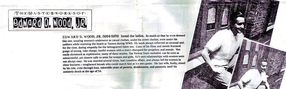 Mostly, his pungent reputation stems from work like Plan Nine being rediscovered during the heyday of the "Bad Movie" craze, part of that hazy 1970s/80s craze wherein previous generations' pop culture had to be torn down and taken apart lest we seem square or unhip (not like that could ever happen nowadays AMIRITE). This was not the democratic, Friars Club roasting style of MST3K and its progeny, which is rooted more in affectionate smacktalk and "can-you-believe-this-shit" goofery (though several Ed movies showed up on the Satellite of Love for their fair share of abuse). Between the Medved Brothers and the Canned Film Festival, most people's image of Wood was as The Worst Anything Ever, a ready-made target for scorn and eye-rolling mockery.