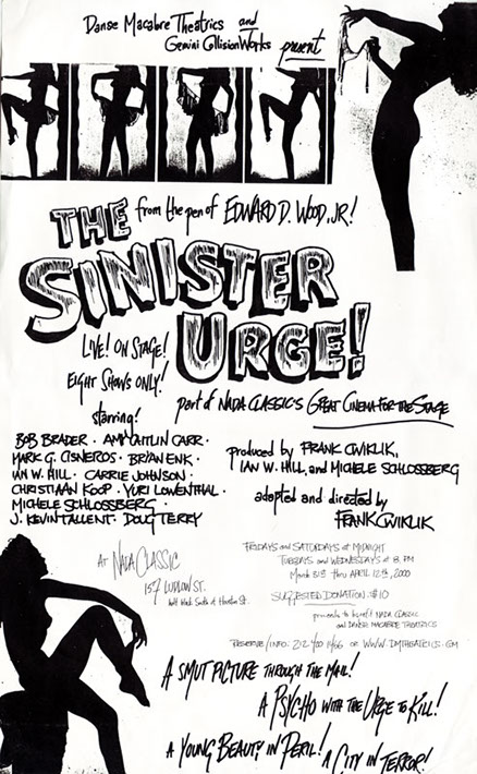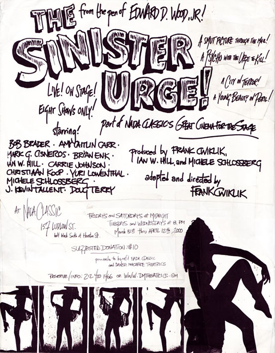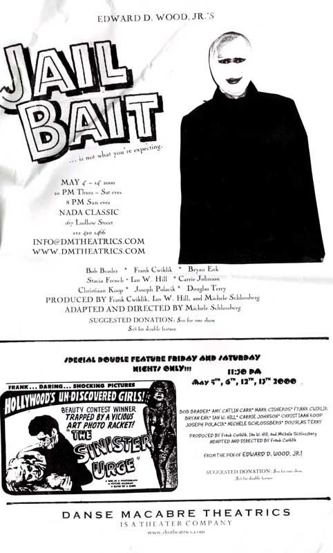 The culmination of DMT's relentless ransacking of the Ed Wood repertory came in the Summer of 2012, when the second of DMTheatrics' festival tributes to Wood, FINAL CURTAIN: THE LAST OF ED WOOD, played as the company's bittersweet swan song to its longtime home, the Red Room. Consisting of five startlingly different productions of Wood classics and obscurities (see below), this month-long extravaganza was both the most ambitious and most audacious project yet attempted by director Frank Cwiklik, its unique and daunting scope attracting press attention from the New York Times, Time Out New York, and others. Seemingly the final word on the glory of Ed from his most unlikely postmortem collaborator, this extraordinary festival was among the last of its kind, a heartfelt farewell to a misunderstood artist and a vanishing era. SEE BELOW FOR INDIVIDUAL SHOW LISTINGS (Bride of the Monster, Night of the Ghouls, The Violent Years, Hot Ice, and The Sinister Urge!)