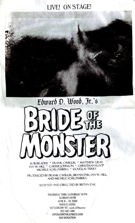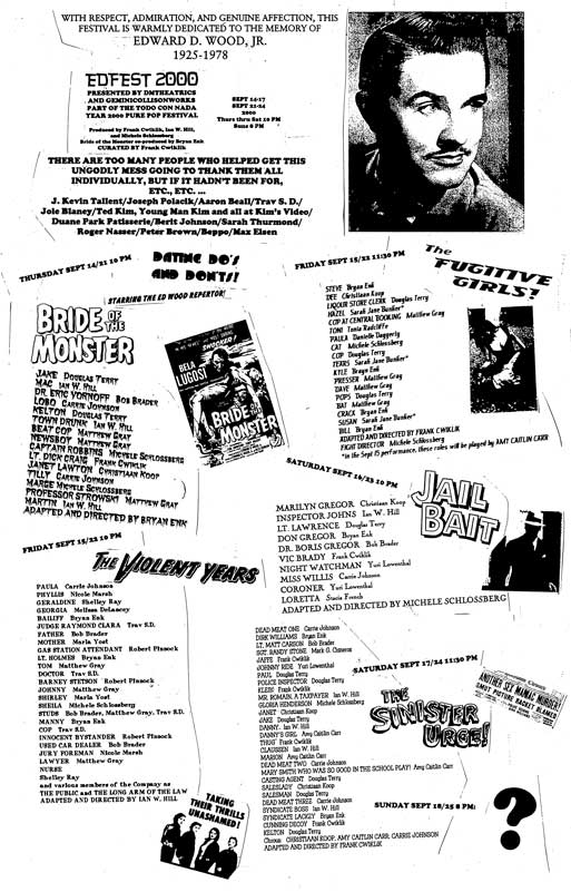 First staged in 2000 as part of the initial DMT/Gemini CollisionWorks Ed Fest, Bride of the Monster was directed by filmmaker Bryan Enk (The Big Bad) as a frothy, goofy spoof of Ed's wooden plot and creaky contrivances. Featuring the shortest, blondest, female-est Lobo you've ever seen, and DMT stalwart Bob Brader as the scenery-chwewing, wild-eyed Vornoff, the show was a roaring success with midnight audiences and enjoyed two sellout runs during the festival.