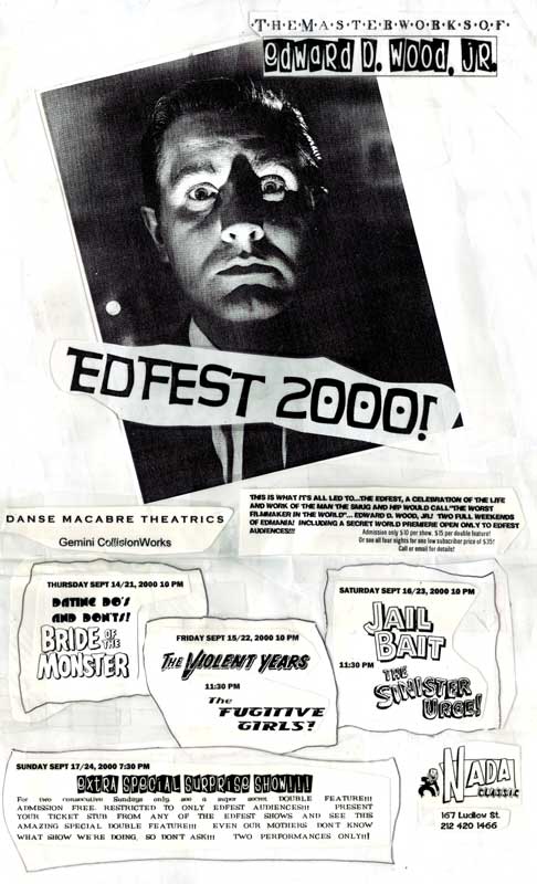 Our adaptations of Ed have run the gamut from Zucker-esque spoof to deadly serious rehabilitation, and everything in between. We've twice staged mammoth festivals of his work, showcasing the man's amazing range and ambition, and hopefully our own. He never really got a shot, and never got his due, and I often wonder if he'd have fared better with bigger budgets, more sympathetic producers, and of course less self-destructive tendencies. But when you treat his work lovingly and with real affection, it's amazing just how good it can actually get, and how close it can be taken to the heights he was clumsily trying to reach. Of course, a lot of his output is amiable rubbish, but it's still wildly entertaining and always worth spending time on, which is why we've returned to the well so often.