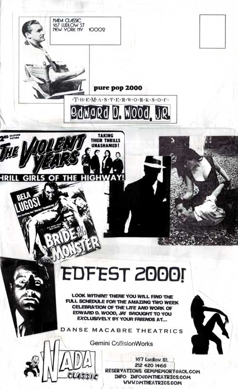 First staged as part of the original EdFest at Todo Con Nada in 2000, this audience favorite came roaring back in 2006 before packed houses at the Red Room, bigger, crazier, nuttier, and more insane than ever. The tired old workhorse then lurched back to life for one last sad, pathetic grasp at glory in the Summer 2012 Final Curtain: The Last of Ed Wood, after which its remains were burned and buried, and the whole cemetery carpet bombed just to be really, really certain. One of the signature pieces in DMT's comedy repertory, with Michele Schlossberg's gravel voiced grande dame Gloria Henderson acting as a de facto mascot for the Ed series on the whole, this is the biggest crowd-pleaser of our long an illustrious history, and is truly beloved by ye humble director, and all three of DMT's fans (okay, two). God help us, everyone.